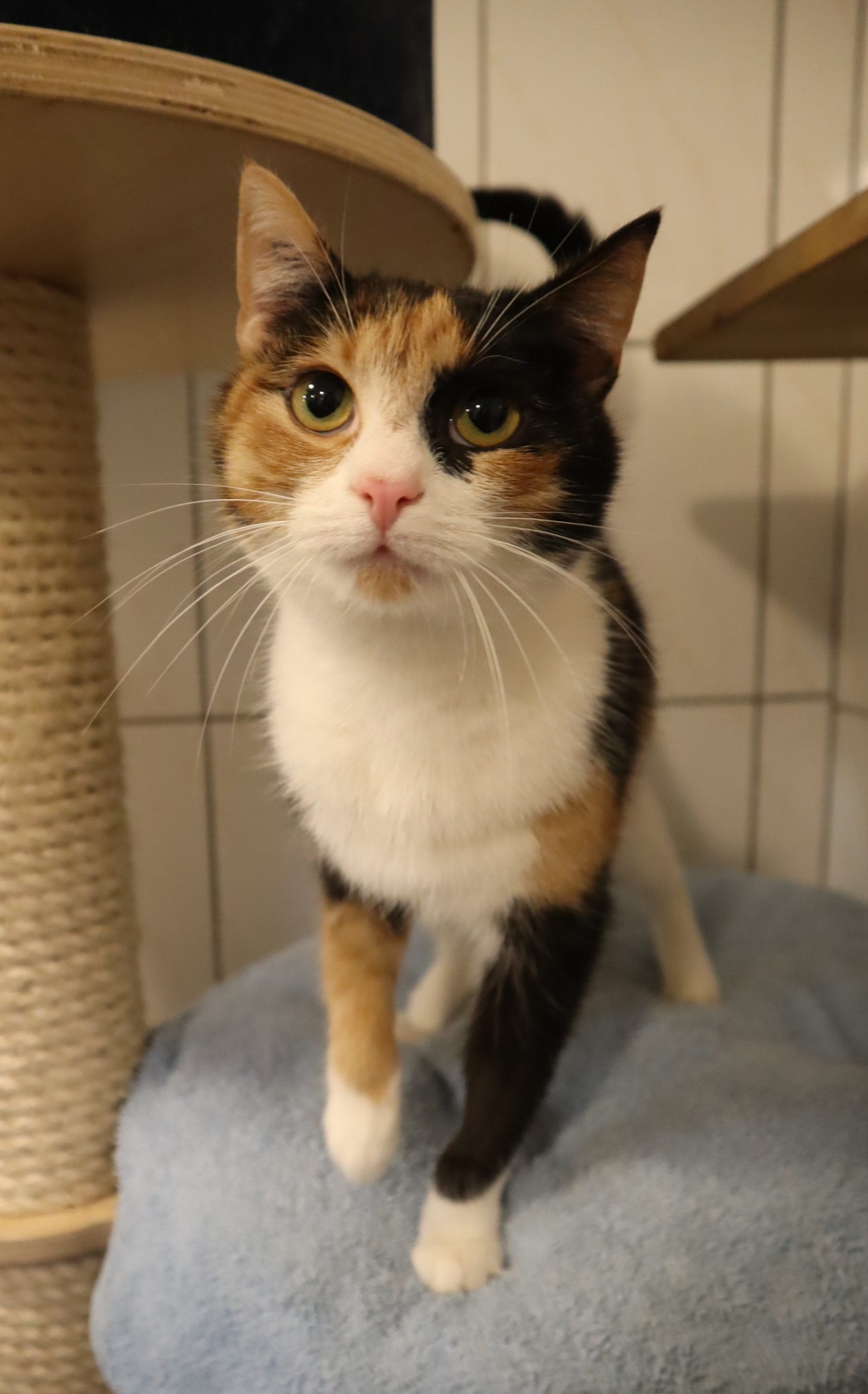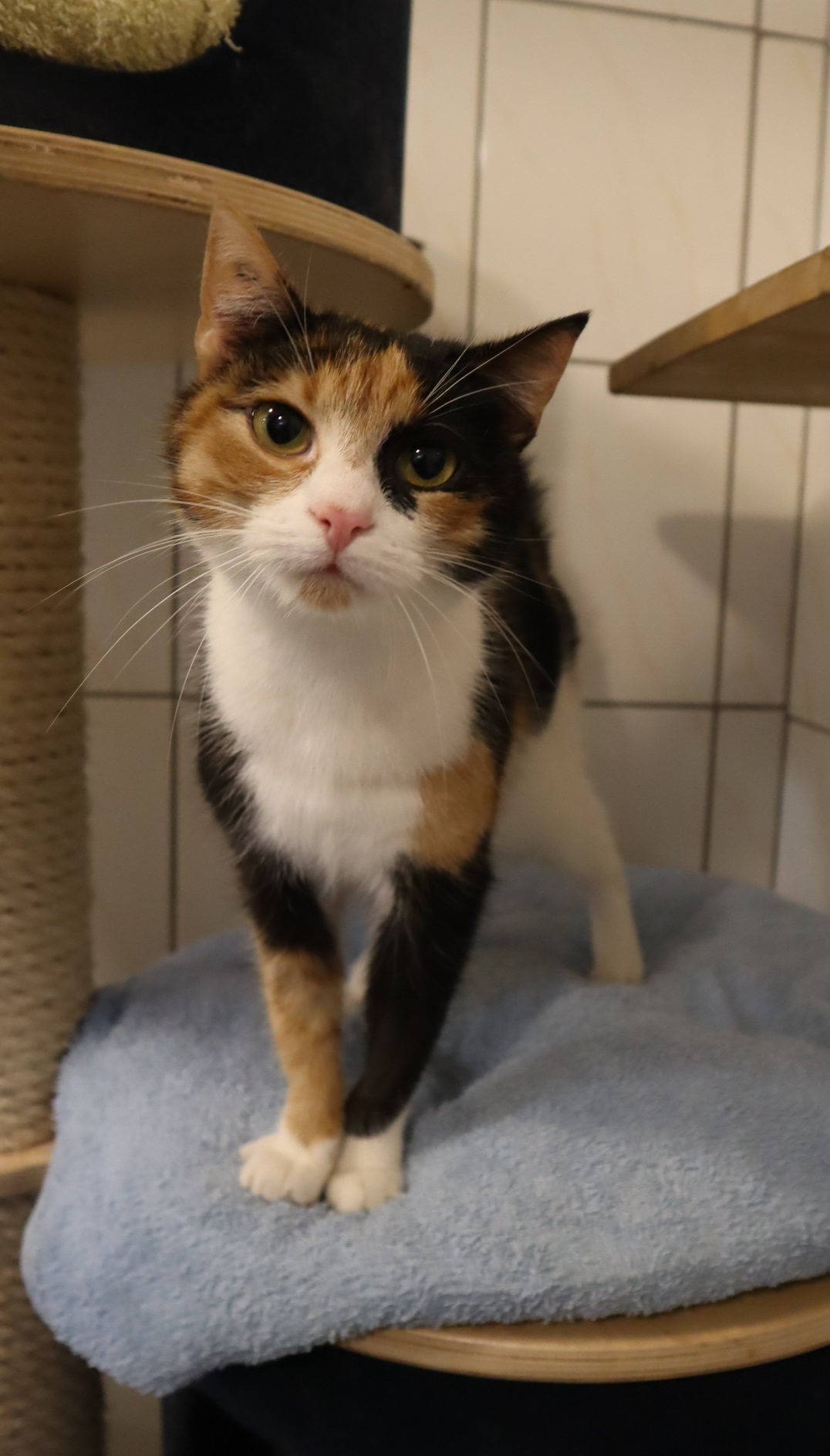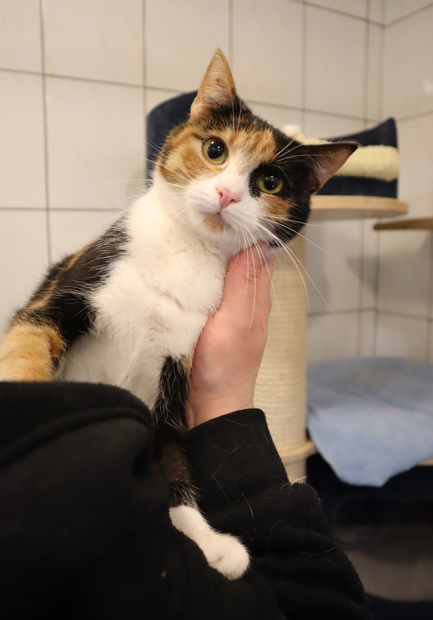 Skala to kotka o absolutnie wyjątkowej urodzie – jej trójkolorowe futerko zdobią niezwykle urocze kropeczki na grzbiecie, które dodają jej niesamowitego wdzięku. To młoda, bystra i bardzo mądra kotka, która od pierwszych chwil daje się poznać jako prawdziwe kocie cudo.